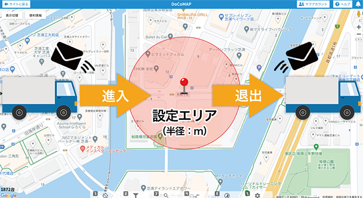 地図上に登録した円の中へ車両が進入・退出した時に自動で記録され、クラウドに1年間データは保存されます。